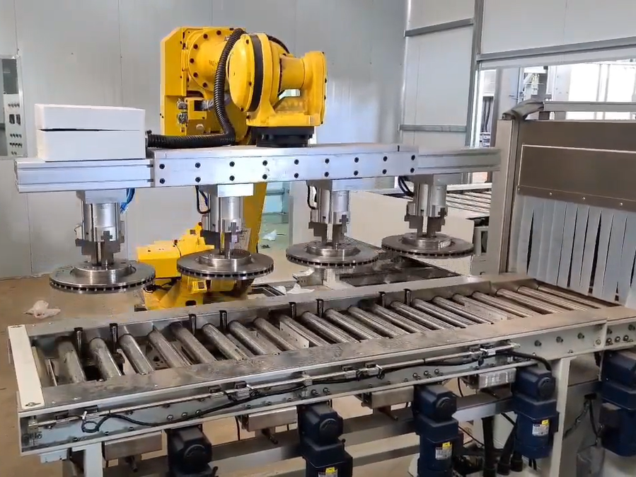 剎車盤轉(zhuǎn)送到涂裝車間的上線位置,用帶有視覺識別系統(tǒng)的機(jī)器人進(jìn)行上線。